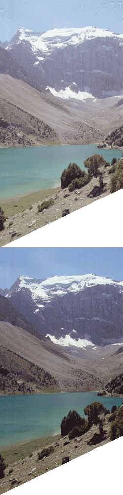cas ne semble le proposer jusqu’à présent. Quoi qu’il en soit, même pour n’atteindre que les monts Fanskye, de longues heures de route sont nécessaires. D’abord, remonter la vallée de la Zeravchan jusqu’au-delà de la petite localité d’Ayni. Puis, obliquer pour la vallée de son affluent la Fan Darya, vallée encore plus étroite. La route atteint normalement le col d’Anzob (3373 m) pour se diriger ensuite vers la capitale Douchanbé. Mais en ce qui nous concerne, nous la quittons avant cela, abordant les monts Fanskye proprement dits. Peu avant le camp du soir (qu’accessoirement, nous devrons monter de nuit !), nous contournons le plus grand lac du massif, le lac Iskanderkul. Qu’Alexandre le Grand soit venu jusqu’ici comme le prétend la légende paraît quand même difficile à avaler…
