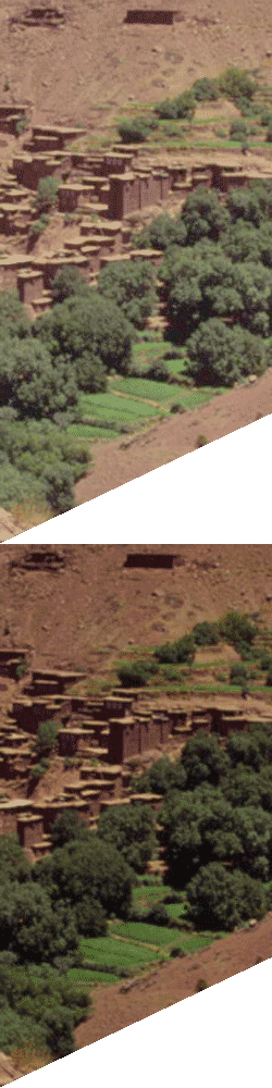 Le lendemain, après le passage de deux cols, nous arrivons au village de Megdaz, qui passe pour l’un des plus beaux du Haut-Atlas. ![]() Les grandes maisons sont paraît-il des greniers à foin. Après ce village nous arrivons dans la vallée de l’oued Tessaoute, que nous allons remonter jusqu’à sa source. Voici Aït Hamza, un village de l’oued Tessaoute : ![]() La vallée de l’oued Tessaout se prolonge ensuite par des gorges étroites et escarpées jusqu’aux sources, situées au pied du M’goun. Le trek prévoyait de remonter ces gorges (un peu de canyoning berbère) et notre guide avait apporté les cordes, baudriers et casques nécessaires. Mais le matin du grand jour, patatras : le temps s’est couvert et notre guide (avec sagesse) n’a pas voulu prendre le risque d’être surpris par un orage au milieu des gorges. Donc, nous avons suivi la route « des mules », par le col Tizi-n-Rouguelt. Malgré notre déception le paysage n’était pas si mal : ![]() Voici notre camp, aux sources de la Tessaout, où nous devons passer deux jours. J’ai gardé de ce camp un souvenir particulier : l’impossibilité de s’isoler avant la nuit tombée! Le camp était situé à proximité du « refuge » du M’goun. Je mets des guillemets car il s’agissait en fait d’une bâtisse assez délabrée, en rien comparable au vrai refuge du CAF existant au pied du Toubkal. Mais la deuxième nuit a éclaté un très violent orage et malgré les rigoles que nous avions creusées, nos tentes se sont retrouvées inondées. Nous avons dû déménager en toute hâte dans le refuge où se trouvaient aussi deux autres groupes. La nuit n’a pas été des plus agréables… ![]() Donc si nous sommes restés deux nuits ici, c’est qu’entre les deux nous devions faire l’ascension du sommet du coin, le M’goun (جبال مكون ⵉⵖⵉⵍ ⵎⴳⵯⵏ) (4068 m). J’en étais encore à une époque où je comptais les 4000 dont je faisais l’ascension. Celui là je l’ai donc vraiment fait pour le chiffre, car le paysage n’était pas terrible et en plus le temps était gris. Qui plus est, j’ai mal dosé mon effort sur la crête sommitale et je suis revenu exténué. Voici quand même une photo de ladite crête sommitale : ![]() Le jour suivant, il y avait encore une gorge qui a été déprogrammée à cause du mauvais temps. Donc, une étape assez courte et une nuit dans une bergerie pour éviter la pluie. Le hic : des animaux avaient dormi à cette place et nous avons attrapé des puces dont nous avons ensuite mis plusieurs jours à nous débarrasser. Les deux jours suivants, nous avons remonté la célèbre