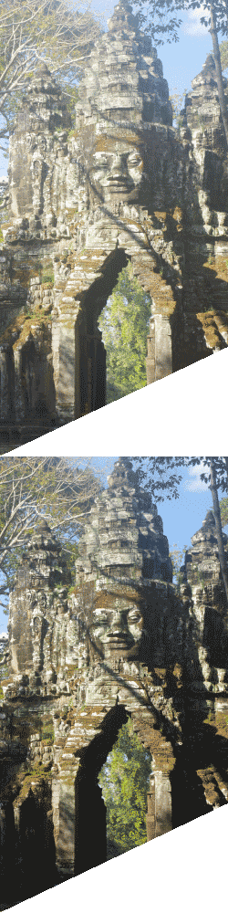 Nous venions de terminer un (très) gros morceau, pourtant la journée et même la matinée étaient loin d’en être terminées avec les visites archéologiques. Au programme en effet, dans la foulée, un autre temple des environs, celui de Banteay Kdei (ប្រាសាទបន្ទាយក្តី). Un temple édifié à la fin du 12ᵉ siècle par Jayavarman VII (lequel cherchait semble-t-il à réconcilier l’hindouisme et le bouddhisme). Déjà saturé par la visite d’Angkor Vat, j’avoue que je ne me souvenais déjà plus trop de ce temple, le soir même de sa visite ! Alors autant dire que deux ans après… Sophana nous a conté une légende mettant en scène deux demi-frères, mais que je n’ai pas suffisamment écoutée pour en retenir quelque péripétie que ce soit, ni même pour en retrouver les détails par des recherches ultérieures. ![]() ![]() ![]() ![]() ![]() ![]() ![]() (Je ne parviens pas toujours parfaitement à cacher les touristes derrière les statues ; cela étant, il y avait assez peu de monde dans ce temple). C’est en contournant pour en ressortir le temple de Banteay Kdei que j’en ai finalement pris les plus belles photos (dont celle que j’ai retenue, après un choix cornélien, comme vignette pour ce voyage). ![]() Déjeuner ensuite dans un restaurant situé entre Banteay Kdei et Angkor Thom. Après cela, nous avons d’abord effectué une courte halte au “bain royal” (Srah Srang) (ស្រះស្រង់), qui est un vaste bassin rectangulaire situé à l’est d’Angkor Thom.