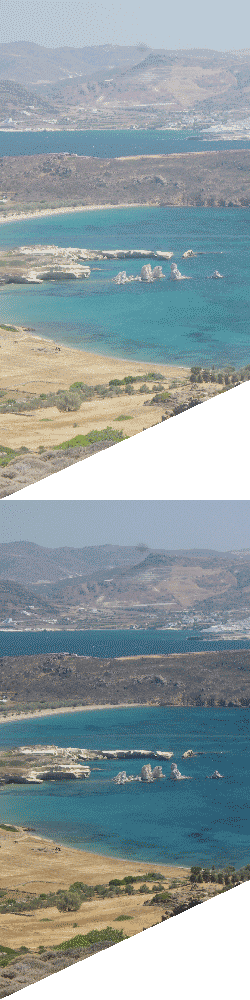 Nous montons ensuite à travers les ruelles du village jusqu’au kastro qui le domine. ![]() Le fort (surmonté d’une petite chapelle) domine toute la partie orientale de l’île ainsi que la rade et son goulet d’entrée. Il ne s’agit pourtant pas du point culminant, situé au sud-ouest. ![]() Voici le seul panoramique que j’ai pris au cours de ce voyage :