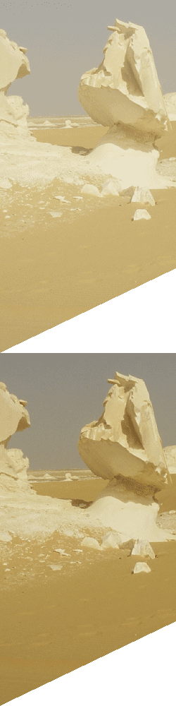 Pendant la soirée les bédouins nous ont interprété quelque chants accompagnés d’un instrument à corde frottée (nous avons également vu circuler quelques fennecs, mais je n’ai pas pu les prendre en photo). La matinée suivante (encore une fois sans notre guide…) nous a vus retourner en direction de l’ancien désert Blanc. Avec au menu de nouvelles formations calcaires… ![]() J’espère que cette photo vous aura rappelé quelque chose ! Voici une autre photo, panoramique et donc numérique, prise au même endroit et dont les couleurs sont radicalement différentes…