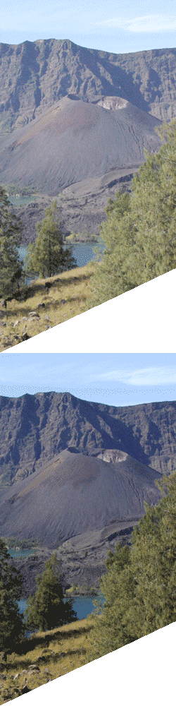 Toute cette montée (et c’est aussi l’un de ses principaux attraits) nous offre en permanence une vue sur le Barujari, le cône éruptif récent du Rinjani (de nombreux touristes passent d’ailleurs un jour de plus sur le Rinjani afin d’aller le visiter de plus près). Comme je l’ai déjà signalé ce cône est à nouveau entré en éruption au printemps 2009. Le magma est sorti du flanc à gauche sur la photo précédente (là où se trouve la tache rouge) et une coulée de lave est venue obstruer la petite baie située en contrebas. ![]() Voici un panoramique pris depuis le col (mon tout premier panoramique effectué avec cet appareil qui ne comporte pas de fonction dédiée…). On distingue bien sur la gauche le sommet du Rinjani (3726 m), celui là même dont nous avions fait l’ascension la veille. Le camp de Plawagan II (premier soir) se trouve en haut de la falaise située à mi hauteur : on comprend bien pourquoi la descente avait été si délicate ! Quant à l’ascension finale, elle suivait la crête sur tout le parcours, et on voit aussi qu’il valait mieux ne pas trop s’en écarter…