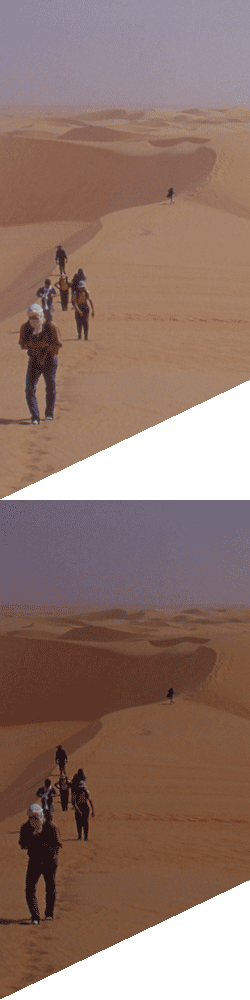 ![]() La mosquée de Chinguetti dans le vieux quartier, le 19 mars 2000 ![]() Paysage du cordon de Zerga, le 24 mars 2000 Mauritanie : Ouadane, Chinguetti, AtarCe n’était à l’époque que la seconde fois que je me rendais au Sahara. L’Algérie étant alors fermée, la Mauritanie était la destination qui montait, avec depuis peu des charters atterrissant directement à Atar, en plein désert. C’est l’un de ces charters que j’ai emprunté à l’aller (départ très tôt, une escale technique à Rabat et aucune « prestation » à bord !), le retour s’étant fait sur vol régulier — air Afrique, ce qui était une autre sorte d’aventure…). Quatre heures d’avion jusqu’à Atar, le même temps qu’il m’avait fallu pour rejoindre Roissy de Bordeaux, en train (l’un des nombreux inconvénients d’habiter la province !). Cette ville de Bordeaux que nous avons survolée à plus de 10 km d’altitude, je me suis un temps demandé quelle pouvait bien être cette jolie petite bourgade… C’est le seul de mes voyages où le Sahara était vraiment tel que se l’imaginent les néophytes : des dunes de sable à perte de vue ! Dunes dans lesquelles il est d’ailleurs assez malaisé de marcher, ce qui rendait ce trek assez physique. Étant données l’époque tardive (deuxième moitié de mars) et la latitude assez basse, la chaleur était assez conséquente ce qui nécessitait d’assez longues siestes en milieu de journée. Corollaire, beaucoup de photos ont été prises en lumière rasante ce qui les rend plutôt réussies. Exception faite du premier jour du voyage où j’ai réellement fait une erreur de débutant : oublier de charger la pellicule dans mon appareil ! Je m’en suis heureusement aperçu assez vite. Le voyage constituait à relier à pied trois villes du Sahara mauritanien : Ouadane (quasiment en ruines), Chinguetti (شنقيط, célèbre pour ses manuscrits arabes médiévaux que possèdent nombre de ses habitants, dans des conditions de conservation pas toujours idéales), et Atar (أطار), la plus peuplée des trois, la capitale de la région (là où nous arrivions en avion). Tout ce voyage se déroulait en bordure de l’immense erg Ouarane, vaste zone inhabitée qui s’étend jusqu’au Mali. À l’exception toutefois des deux derniers jours (à proximité d’Atar), où nous rejoignons la région montagneuse de l’Adrar. Je n’avais pas de GPS pour ce voyage, et ne possède pour toute carte que la carte IGN au 1/1 000 000e. Par ailleurs le terrain contient peu de points de repère facilement identifiables, si l’on excepte les trois ou quatre derniers jours (cordon de Zerga et Adrar), et les points fixes que constituent les villes d’Ouadane et de Chinguetti. La localisation de beaucoup de mes photos est donc très incertaine : je ne connais même pas l’emplacement de certaines oasis comme El Rhéouya, Tanouchert ou Lagueïla. Venons-en maintenant à la chronologie du voyage, avec pour commencer, comme je l’ai dit, une journée sans photo. Quelques heures de 4 × 4 nous ont donc menés à Ouadane, avec en cours de route une nuit de bivouac à El Rhéouya. Nous nous sommes à deux reprises arrêtés pour prendre le thé sous la raïma (tente) des nomades. Ouadane est une ville datant du Xe siècle, très prospère au Moyen-Âge où elle était la rivale de Chinguetti. Mais elle fut quasiment abandonnée au XVIIe siècle, et il ne reste plus aujourd’hui que quelques centaines d’habitants. Les maisons de Ouadane, construites en pierre, sont le plus souvent en ruines, mais il arrive en se promenant dans les ruelles de trouver une maison habitée. À l’instar de Chinguetti, Ouadane contient de nombreux manuscrits médiévaux (une grosse majorité d’entre eux étant des commentaires du Coran, mais une petite partie traite aussi de sujets académiques). La plupart de ces manuscrits sont situés chez des particuliers, où il se conservent assez mal (sable, termites, humidité). Une association tente de les regrouper dans une bibliothèque pour mieux les conserver et essayer de les restaurer (et de les dater), mais il faut convaincre les propriétaires ce qui n’est pas évident. Ce n’est pas de Ouadane que nous avons démarré le trek mais de la petite palmeraie de Tanouchert, à moitié envahie par les dunes. C’est là que j’ai pu prendre mes premières photos. Nous nous sommes baladés quelque temps dans l’oasis et dans le village, avant d’installer notre second bivouac dans les environs. ![]() Les choses sérieuses ont commencé le lendemain matin : deux semaine de randonnée chamelière dans le sable ! Nos chameaux nous ont rejoints au petit matin. Notre itinéraire suivait peu ou prou la lisière de l’erg Ouarane, à l’intérieur duquel très peu de monde s’aventure. ![]() Nous avons vu une trace de vipère à cornes durant la matinée : il faut dire que la saison était déjà bien avancée ! La monotonie de ces dunes se trouve (fort peu !) brisée par le massif gréseux d’Herrour : quelques tas de cailloux émergeant avec peine des dunes de sable. Notre guide, assez féru en géologie (ce qui n’est pas si courant parmi les guides) nous a affirmé que ce massif aurait une origine glaciaire (la Mauritanie se serait retrouvée au pôle sud à l’ère primaire puis aurait dérivé). J’ai quand même trouvé cette théorie quelque peu fumeuse… ![]() Le jour suivant était une étape de liaison que j’ai trouvée un peu fastidieuse (avec beaucoup moins de relief). Nous avons campé en haut d’une dune isolée, sur laquelle nous avons failli avoir de la pluie. Les chameliers ont joué entre eux à un sorte de jeu de dames, dans le sable, en se servant brindilles et de crottes de chameau en guise de pions. ![]() Et j’ai encore moins aimé le jour d’après : après un passage dans les ruines d’un village du Xe siècle (photo) dont je n’ai pas retenu le nom, nous sommes revenus camper à El Rhéouya,