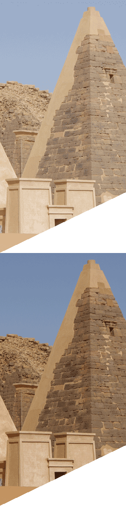 Nous avons intégralement consacré la journée suivante à cet exceptionnel site archéologique qu’est Méroé (مرواه). L’idée de venir au Soudan m’était venue de très nombreuses années auparavant, au cours d’un voyage en Égypte que j’avais effectué avec mes parents. Mon père avait acheté dans une boutique de souvenirs des souks du Caire l’un de ces ouvrages illustrés sur papier glacé que l’on trouve dans tous les pays touristiques du monde, consacré à l’Afrique du Nil ; lequel décrivait donc par le menu tous les les pays peu ou prou localisés entre le lac Victoria et la Méditerranée, du Rwanda et au Burundi à l’Égypte en passant par le Soudan et l’Éthiopie (pas mal d’endroits, soit dit en passant, où les touristes ne se bousculent guère au portillon). On trouvait dans ce livre des photos de forêts tropicales, de chutes d’eau, de tribus africaines peu habillées (ça existe encore ?), d’églises orthodoxes coptes ou éthiopiennes, et puis bien sûr les incontournables pyramides et temples de haute et de basse Égypte. Mes parmi toutes ces illustrations, il y en avait une qui avait interpellé plus que les autres l’amateur de désert en herbe que j’étais : c’était celle de Méroé au Soudan et de cette multitude de pyramides, certes de petite taille mais aussi beaucoup plus raides que les pyramides égyptiennes, et surtout envahies par les sables du désert ce qui confère à ce site un caractère unique. Notre camp aménagé était situé à environ un kilomètre du site, et pour nous y rendre le matin l’organisation avait prévu non pas des véhicules, mais des dromadaires. Idée pour le moins baroque, ce en quoi j’ai tout de go décrété que je ne voulais pas monter sur un chameau et que j’entendais me rendre sur les lieux à pied. Après s’être renseigné auprès des locaux pour s’assurer que cela ne posait pas de problème, le guide a finalement acquiescé. Mon attitude a quelque peu étonné mes compagnons de voyage italiens (il faut dire que chez les Italiens et contrairement à beaucoup de Français, la randonnée n’est pas une chose naturelle), mais finalement une bonne partie d’entre eux ont imité mon exemple.