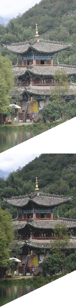 Nous avons ensuite visité un intéressant palais (sorte de Cité interdite en miniature), le palais des Mou (木), qui paradoxalement était presque désert. Il n’était d’ailleurs pas au programme de notre voyage, nous en avons donc payé l’entrée. ![]() ![]() La colline qui surplombe le palais des Mou offre de très intéressantes vues sur Li-kiang, tant sur la partie ancienne que sur la ville nouvelle. ![]() En soirée, le programme incluait un concert de musique traditionnelle na-si. Bien que notre guide Philippe ait dit pis que pendre de cette prestation, je l’ai trouvée assez intéressante. Les musiciens étaient tous très âgés (en dehors de deux jeunes chanteuses), Joey nous a expliqué que (bien malheureusement) les jeunes ne s’intéressaient plus du tout à cette musique ancestrale. Ici et comme (presque) partout, il n’y a plus que le boumboum américain qui compte. ![]() Petite vidéo avec des extraits du concert (je reconnais que pour nos oreilles occidentales c’est un peu âpre…). Le lendemain nous attendait un long et pénible trajet en véhicule, dans un pays très accidenté, afin de rejoindre les berges du lac Loukou (泸沽湖, Lugu). Nous avons en particulier franchi plusieurs cols, dont l’un à plus de 3 000 m d’altitude. La première partie du trajet à consisté à rejoindre la vallée du fleuve Yang-Tsé (扬子江, 揚子江, Yangzi Jiang) que nous avons traversée par un pont. La descente dans la vallée a nécessité de parcourir de nombreux lacets. Comme on peut le voir la météo laissait aussi fortement à désirer. ![]() Nous nous sommes ensuite arrêtés dans la ville de Ning-leang (宁蒗彝族自治县, Ningliang) pour en visiter le marché. Une localité restée à l’écart de la modernité, les conditions d’hygiène du marché étaient davantage celles d’un pays du tiers-monde. Mes compagnons de voyage (en particulier la gent féminine) ont également pu y tester les toilettes publiques à la chinoise, certes non mixtes mais sans cabines individuelles, à la manière des latrines romaines. L’arrivée d’une occidentale en un tel endroit provoque paraît-il immédiatement un attroupement de Chinoises pour lesquelles cela semble constituer la distraction du jour. Juste avant le lac Loukou, il y avait donc ce fameux col à 3000, dans une terre argileuse et sous une végétation de résineux. Quelque semaines auparavant, un éboulement avait provoqué l’interruption de la route, forçant le groupe Allibert qui nous avait précédé à franchir le col à pied en portant les bagages ! Heureusement les Chinois travaillent vite, la déviation était déjà praticable bien que non terminée. Le lac Loukou (altitude : 2 685 m), aux eaux calmes et aux reflets photogéniques, était avec Li-kiang le plus bel endroit du voyage, le plus beau site naturel en tout cas. Et ô miracle, le temps s’est dégagé dans la soirée (ce qui malheureusement ne devait pas durer).